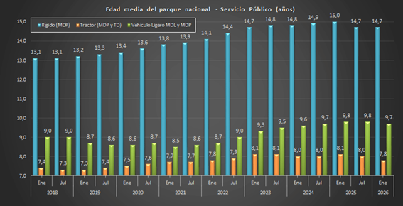 Según los datos publicados por el Observatorio de la Oferta y la Demanda de Transporte del Ministerio de Transportes y Movilidad Sostenible, en enero de 2026 la edad media de los vehículos pesados rígidos se mantiene en 14,7 años. En el caso de los vehículos ligeros desciende una décima, hasta los 9,7 años, y en las tractoras la reducción es de dos décimas, situándose en 7,8 años.